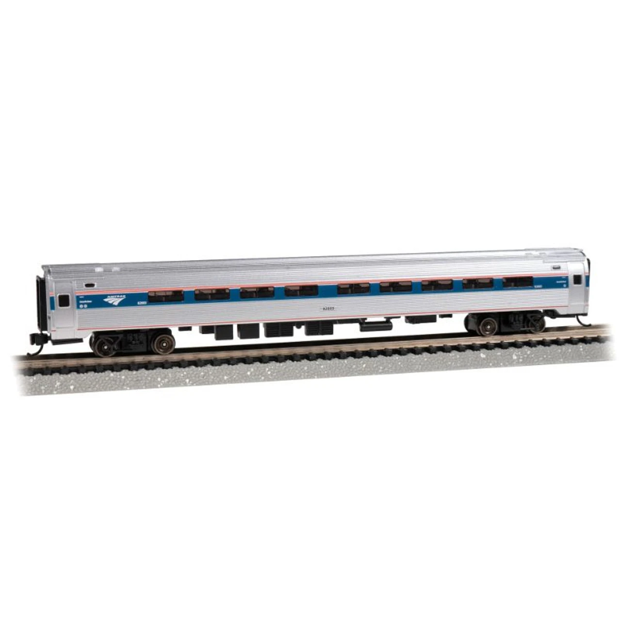 Budd Amfleet® I #82803- Coach Class Car (Phase VI) – N Scale. Developed by the Budd Company in the mid-1970s, the Amfleet I was the first single-level passenger car designed exclusively for Amtrak®. With over 350 still in service across the United States today, it remains the backbone of Amtrak’s single-level passenger car fleet and can be found on regional and intercity trains from coast to coast. Bachmann’s N scale Amfleet I features a fully detailed and lighted interior, all-metal wheels, and body-mounted E-Z Mate® Mark II couplers.
