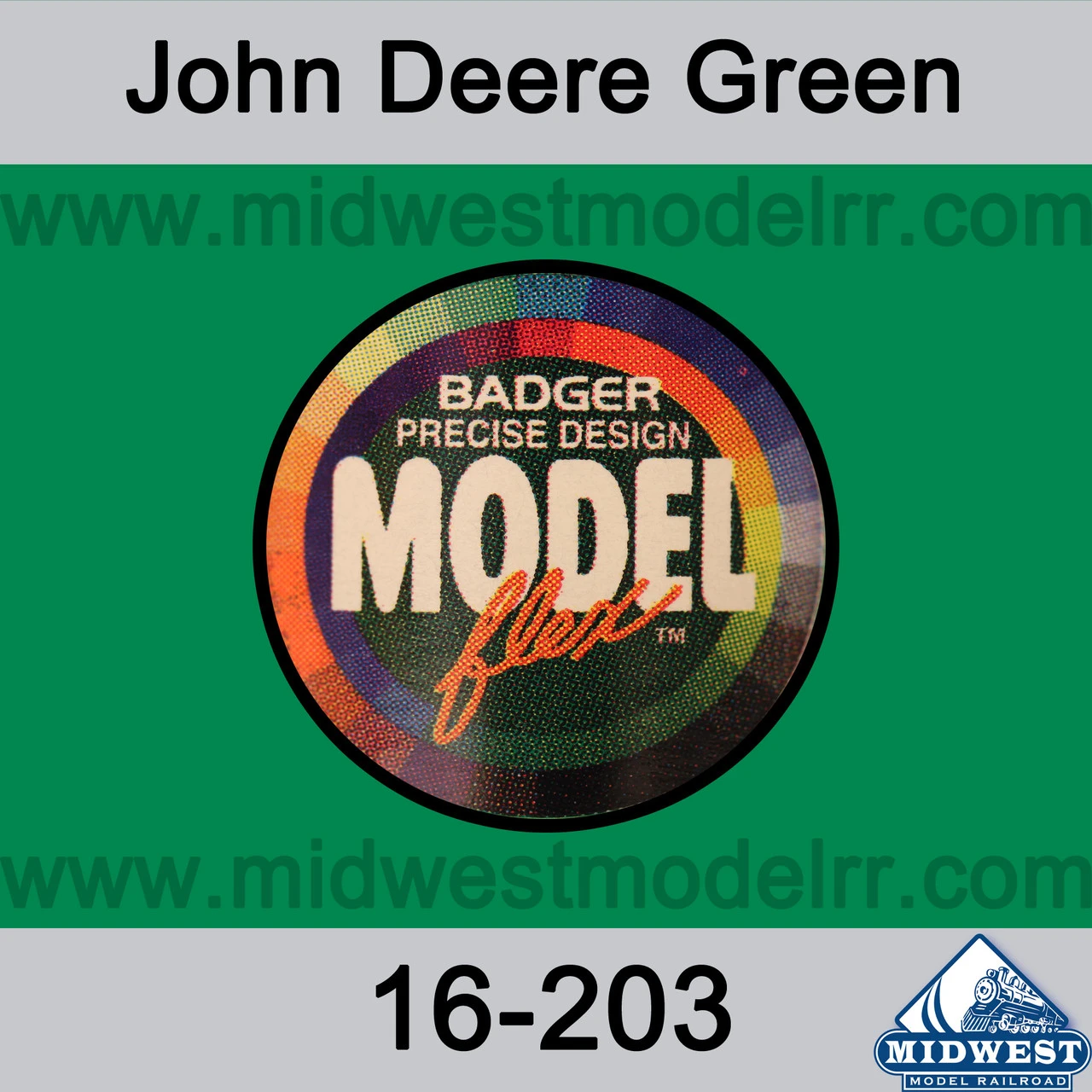 John Deere Green 16-203 MODELflex Badger PAINT FOR THE PROFESSIONAL MODELER If you’re not satisfied until every detail is perfect, then let MODELflex¨ bring your models to life. It is a superior hobby paint designed to help modelers achieve authentic, professional painting results, with greater ease and proficiency. Waterbased MODELflex¨ is easy to apply with an airbrush or paint brush and clean-up is fast and easy with MODELflex ¨ cleaner. MODELflex¨ paint dries in 12 to 15 minutes at room temperature (3 to 5 minutes if heat dried). FEATURESAvailable in 1 oz plastic bottlesMade of high quality organic pigments for superior color retention and color fastnessMODELflex offers extreme fine-coat coverage without conceling intricate detailsprimers are not required with most colors (primers are recommended with lighter colors)Superior adhesion to most plastics, resins, metals and various other substratesDecaling and detailing may begin in 15 minutes if heat driedEnvironmentally friendly, safe to use, non-flamable, non-cardinogenic