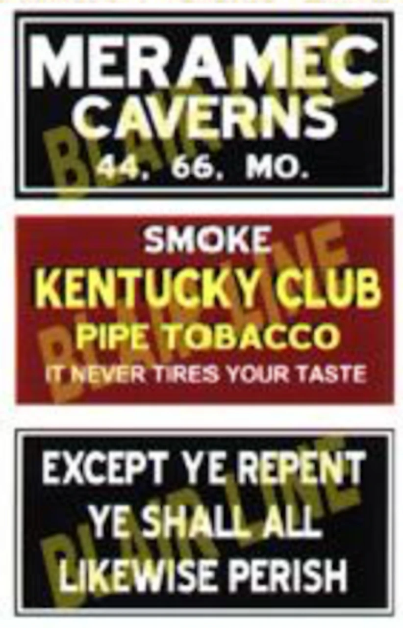 Another version of the Midwest classic Meramec Caverns. Kentucky Club tobacco and “Repent or perish” N Scale signs approx. size – 1-1/4″ x 3/4″ They still stand, the painted barn and wall signs of yesterday. Some have been repainted…renewed. And some are in an advanced state of decay. And sadly many are gone. A once common method of advertising is slowly slipping away as are the barns and old buildings the signs were painted on. We are offering water transfer decal reproductions of old barn and wall sign decals. Use them on your barns, building walls or as a billboard. Each set comes with three signs as shown.