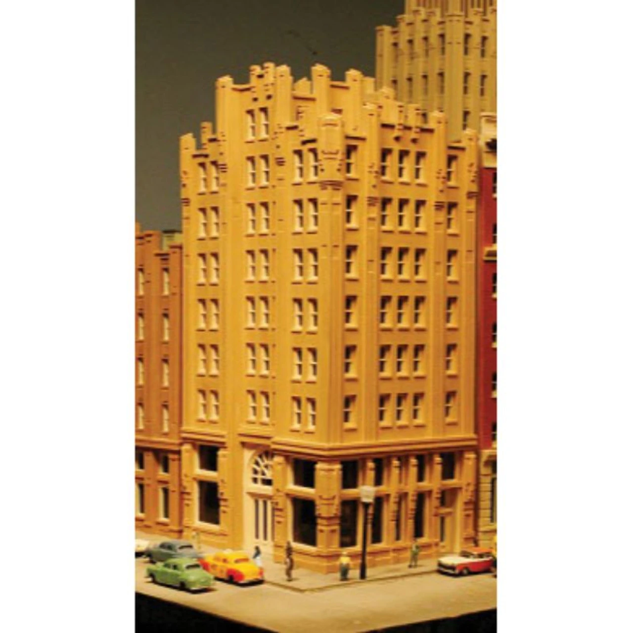 Century Plaza — Kit – 4-1/8 x 3-3/8″ x 8-3/8″ This exquisite corner building has a gorgeous arched front entry door and is based on the same Art Deco design as the Ivory Tower. The Century Plaza features a fully detailed rooftop penthouse. The grand number of windows are separate and pre-colored, as are the entry doors. All walls are pre-colored “stone”. No painting is needed.