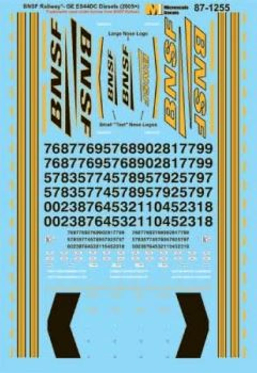 Circa: 2005+ Scale: HO Scale Equipment Type: Diesel – Railway – GE ES44DC Instruction Sheet: 87-1255 Description: Diesel – Railway – GE ES44DC – Waterslide Decal – HO Scale Microscale HO Scale – BNSF Railway – Diesels, GE ES44DCs (2005+)