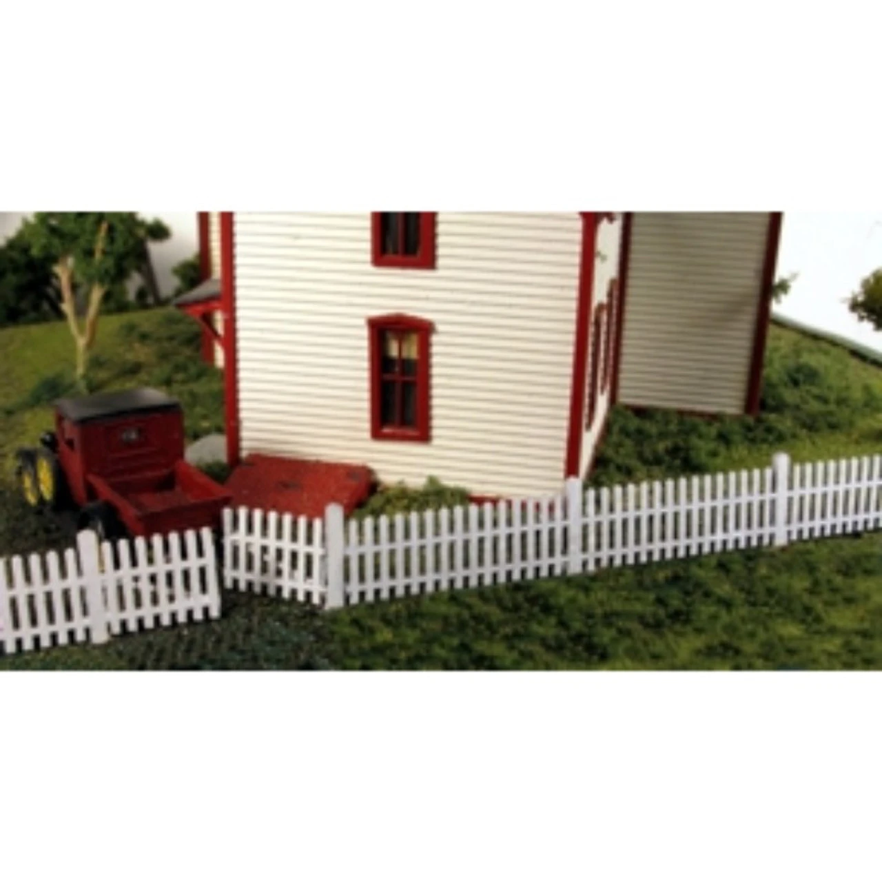 Each kit is laser cut from rigid fiber board. Eight 38 scale foot strips of picket fencing and fence bracing with a peel-and-stick tape backing for easy assembly.  Six gate sections.  336 scale feet of fence. (Approx. 12-3/4 inches) Instructions included.