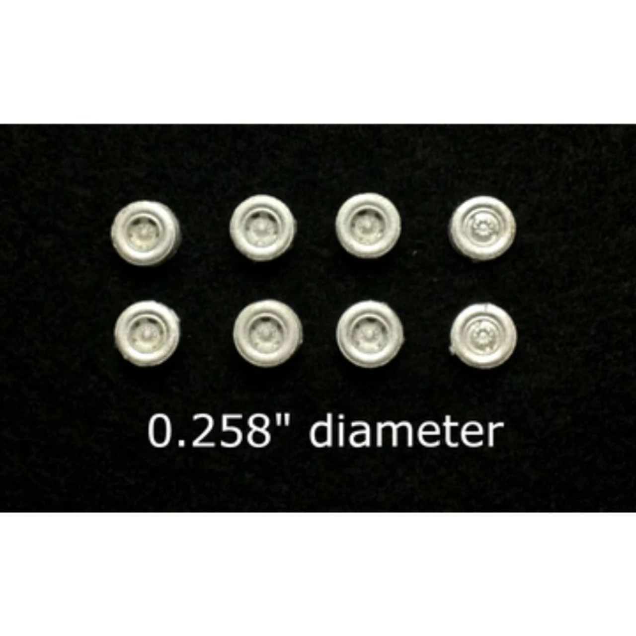 These wheels are included with our KW trucks. They are 0.258″ diameter. Showcase Miniatures N Scale Tri-Axle Heavy Duty Steel Wheels