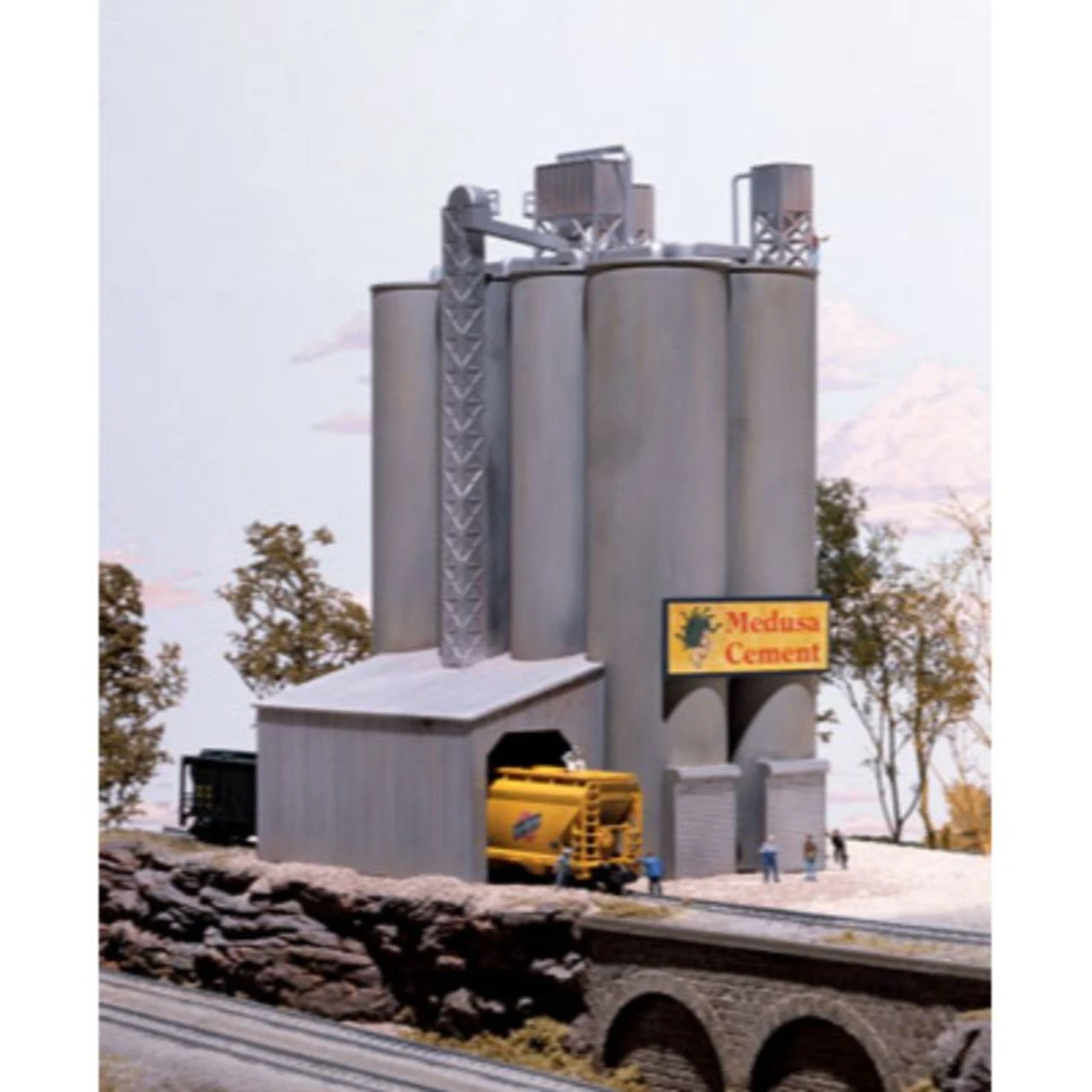 Cement distribution plants such as Medusa Cement are vital to the construction industry, providing the bulk cement used to make concrete. This Walthers Cornerstone kit makes a great addition to an industrial district or along a waterfront (the location of the prototype this kit is based on). With eight tall storage silos, conveyor tower and rail car unloading shed this structure looks impressively large but is sized to fit most layouts. Other details include separate roll-up doors for truck loading, plus separate rooftop piping, railing and dust collectors. Medusa Cement is just one of a wide variety of Cornerstone industrial buildings. As shown the kit measures: 5-3/8 x 4-1/2″ 13.6 x 11.4cm Contemporary trackside industry Prototypes transfer cement from covered hoppers to trucks Railcar loading shed Rooftop piping and details Silo truck loading doors Easy-to-build plastic kit Realistic signs