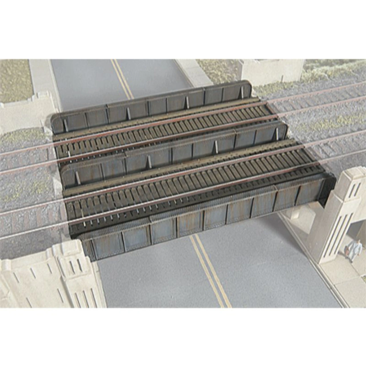 The Cornerstone Through Plate-Girder Bridge kit is based on one of the most common North American railroad designs, typically used to cross short distances, and as approach spans for longer obstacles. In service for for decades, they’re constructed of steel sections riveted together to form girders, and are known as through types as the track passes between, rather than on top of the spans. Features include: One of the most common American railroad bridge designs Used where extra clearance is needed above highways, waterways & other railroads Fits steam-, diesel- & modern-eras Includes Risers to model as an approach span for the Single-Track Arched Pratt Truss Bridge (933-3870, sold separately) Build as single- or double-track with parts included Easily added to new or existing scenery Authentic rivets and other details Use with Cornerstone Double-Track Truss Bridge (933-3242), Bridge Pier 2-Pack (933-3880) and Bridge Abutment 2-Pack (933-3881) each sold separately – adaptable to most N Scale bridges Molded in dark gray plastic