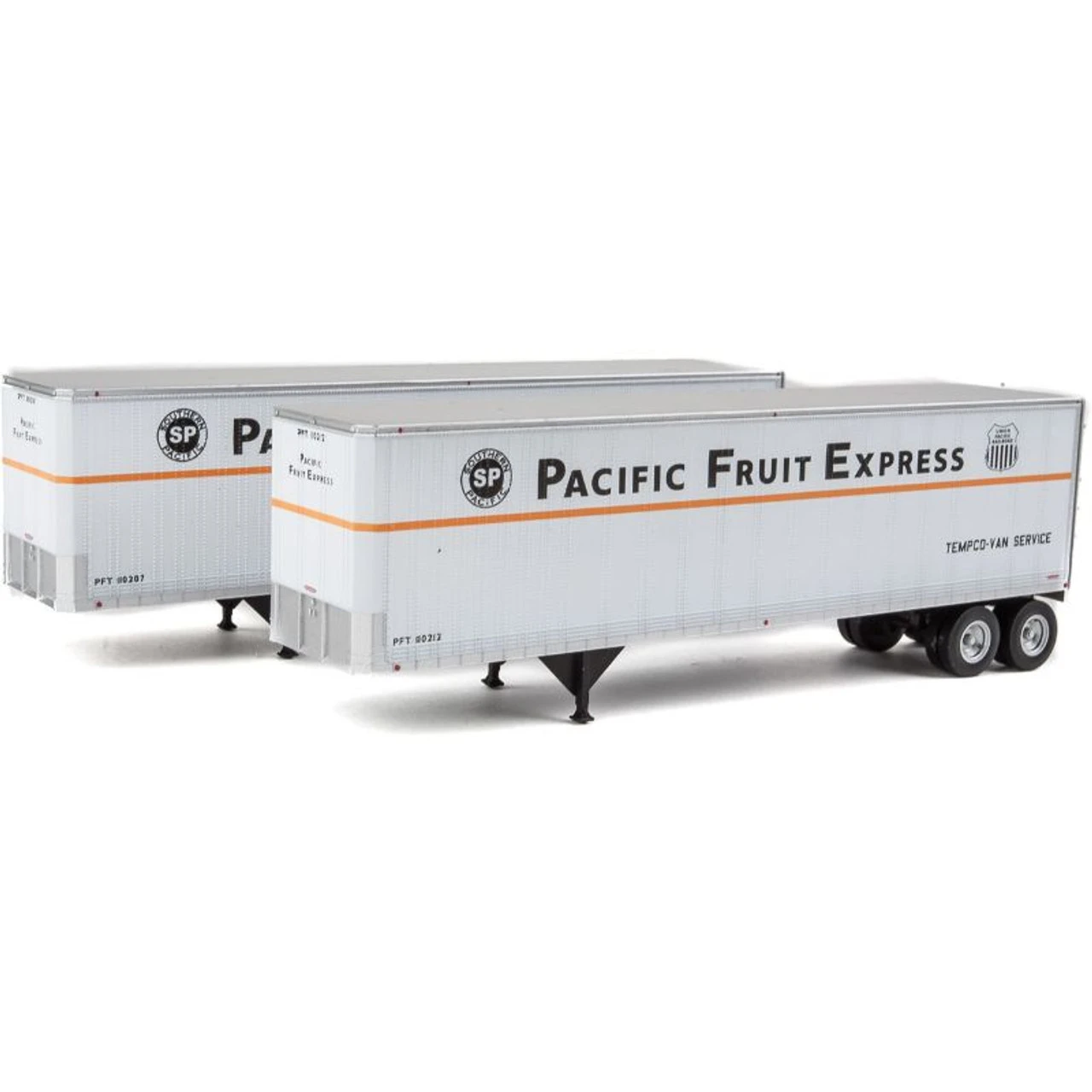 Walthers SceneMaster 40′ 1970s-style Trailmobile Dry Van 2-Packs are a great addition to vintage trailer-on-flatcar (TOFC) service and period HO highways from the 1970s to the 1980s. Fully assembled and ready for service, each includes two matching trailers featuring: Standard length trailers seen all across North America in the 1970s and 1980s Must-have for modeling period piggyback service Used by dozens of railroads and trucking companies Instant detail for vintage highways, loading docks and terminals Highly detailed body with scale rivet details, four door latch bars, and landing gear in up and down positions Walthers HO Scale 40′ Trailmobile Trailer 2-Pack Road Name: Pacific Fruit Express (PFE) Road Number: Photo may not show actual road number . Please see description for actual road number