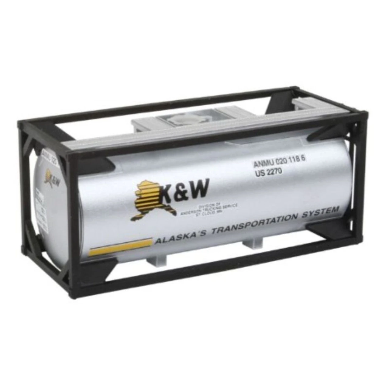 Product Information * Prepainted & lettered * Easy assembly * Realistic loads for WalthersProto(R), WalthersMainline(R) & other well cars * Great detail for terminals, highways and industrial scenes Walthers HO Scale 20′ Tank Container K&W Alaska