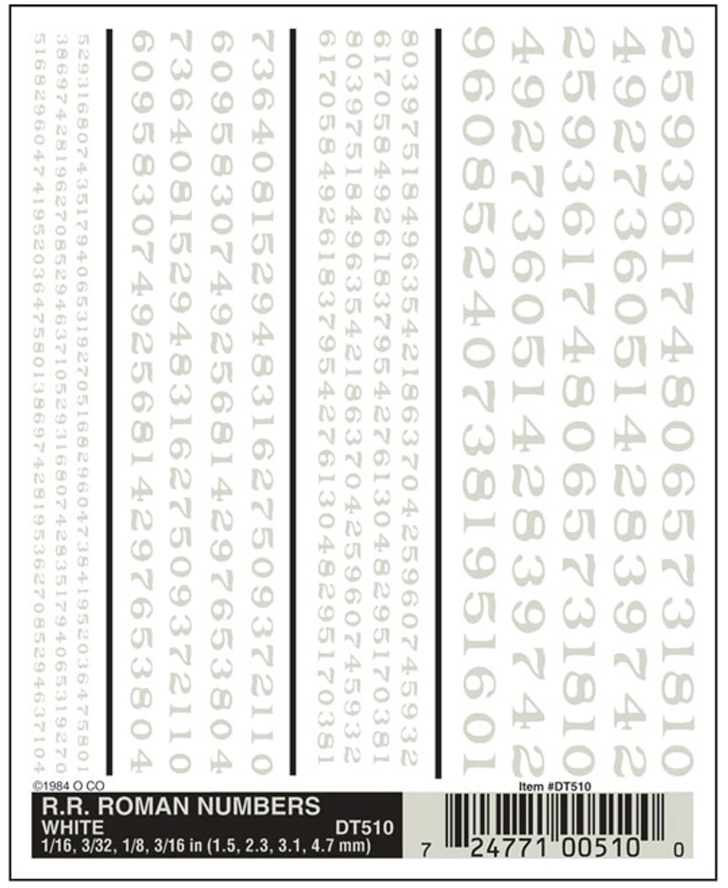 RR Roman Numbers White DT510 Font sizes 1/16″, 3/32″, 1/8″, 3/16″ (1.5 mm, 2.3 mm, 3.1 mm, 4.7 mm) One sheet 4″ x 5″ (10.1 cm x 12.7 cm)