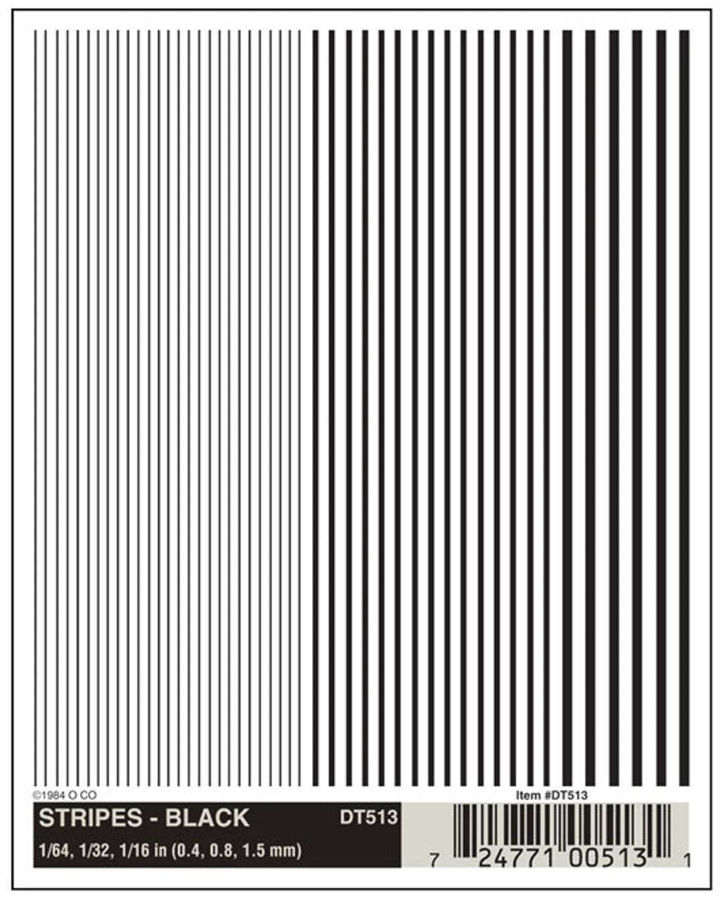 Stripes Black DT513 Font sizes 1/64″, 1/32″, 1/16″ (0.39 mm, 0.79 mm, 1.5 mm) One sheet 4″ x 5″ (10.1 cm x 12.7 cm)